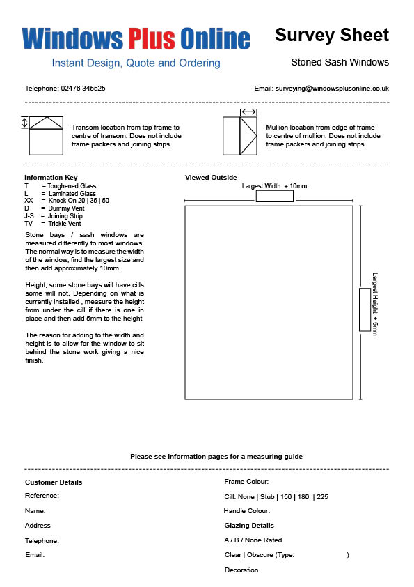 The uPVC Stoned Sash measuring sheet can be downloaded using the button below.Below you will find an example of what to expect in your download.